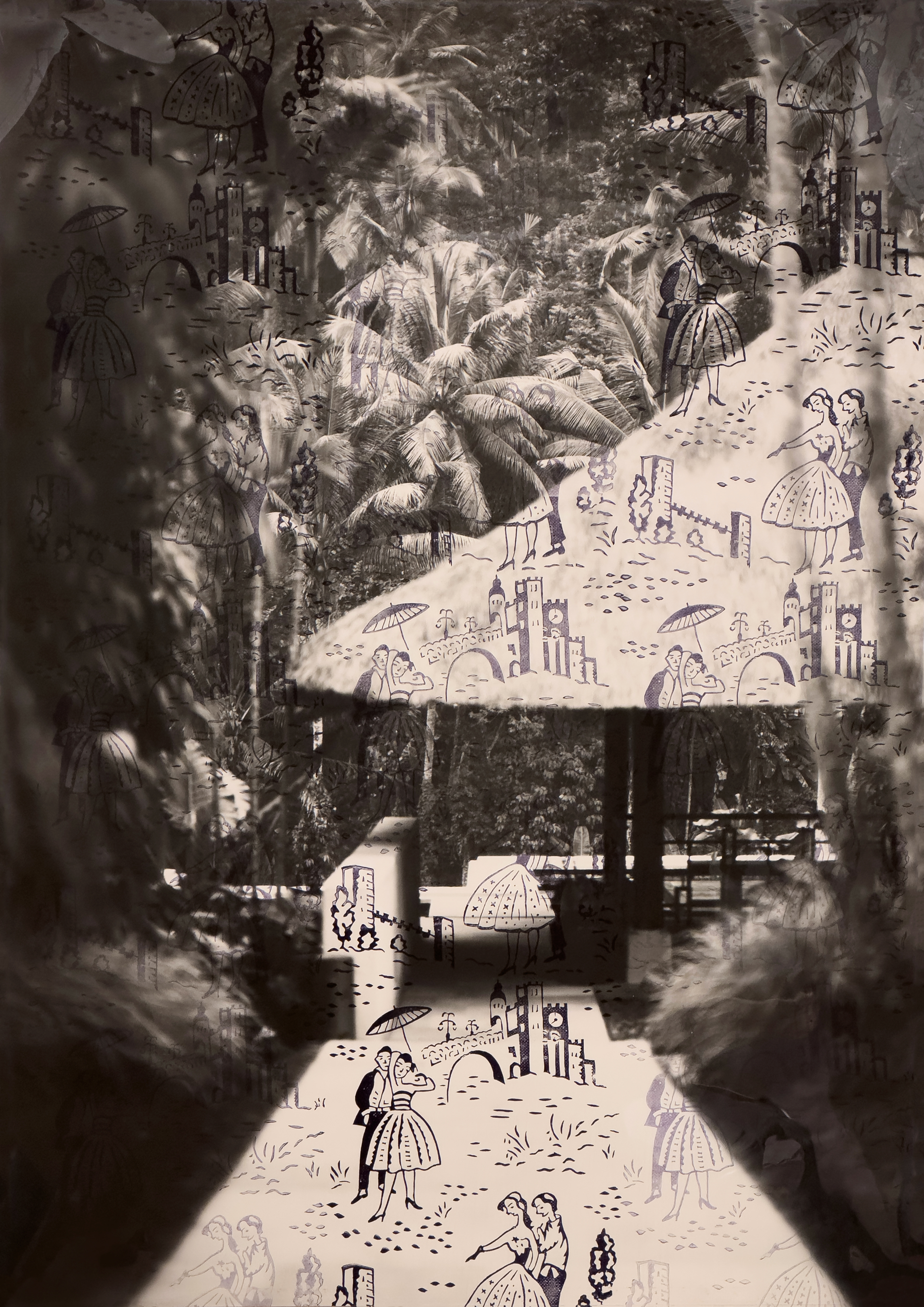 55 chapters. The room-filling installation extends across the entire walls of the main room of Raum 001. Based on the novel 'Spring Snow' by Yukio Mishima, each of the 55 works represents a chapter of the book. Text fragments from the respective chapters were visualized using Nils Dunkel's own artistic vocabulary: Black and white photographs are overlaid with historical pattern rollers and black ink, and a color filter film sets the mood. Like memories from the past, from faded to brightly glaring.